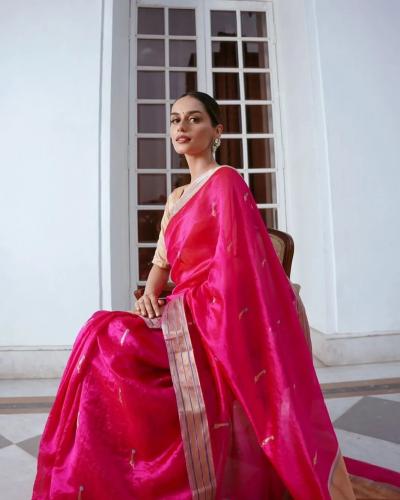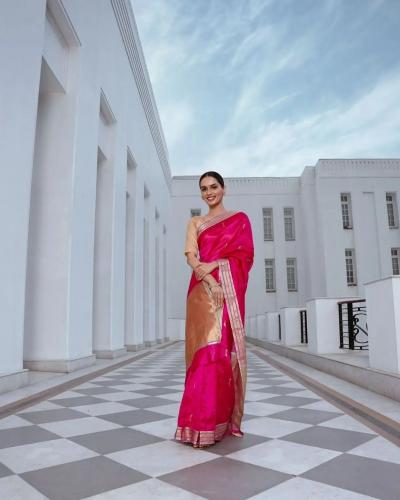 इन तस्वीरों में मानुषी ने पिंक कलर की कढ़ाईदार साड़ी पहनी हुई है जिसमे गोल्डन बॉर्डर हैं। (फोटो: इंस्टाग्राम)