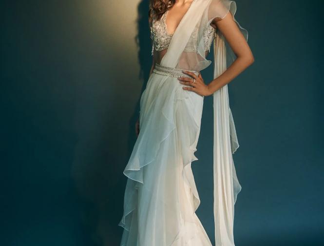 इन तस्वीरों में मानुषी ने व्हाइट फ्रील वाली साड़ी पहनी हुई हैं। (फोटो: इंस्टाग्राम)