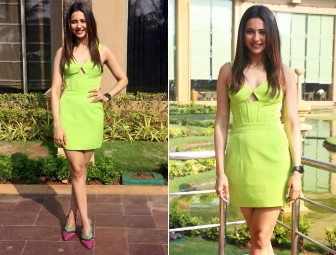 प्रमोशन में रकुल प्रीत सिंह ने ग्रीन कलर की वन पीस ड्रेस पहनी हुई थी।
