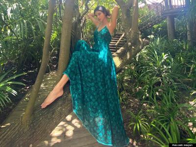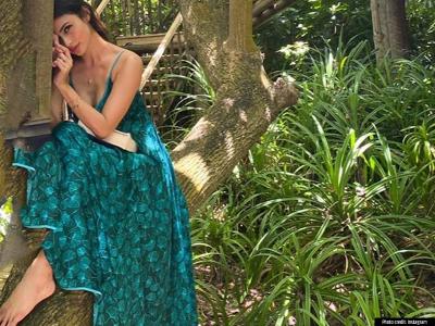 एक बार फिर लॉन्ग ग्रीन ड्रेस में एक पेड़ के साथ फोटोज खिंचवाती नजर आ रही हैं।