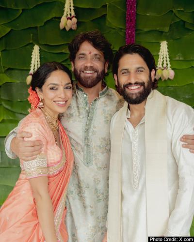 नागार्जुन अक्किनेनी ने एक्स पर दो तस्वीरें साझा की हैं। पहले में, उन्हें भावी जोड़े के साथ पोज देते हुए देखा जा सकता है और दूसरे में सोभिता को चैतन्य के कंधों पर अपना सिर झुकाए देखा जा सकता है।
