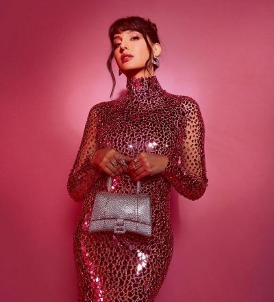 नोरा ने अपने इस लुक को कम्पलीट करने के लिए हूप ईयररिंग्स पहने है, पिंक लिप शेड के साथ बालों को फ्रंट फ्रिंजेस के साथ कर्ल्स में खुला छोड़ा था। (फोटो: इंस्टाग्राम)