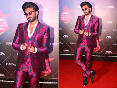 अपने ड्रेसिंग सेंस के लिए जाने जाने वाले रणवीर सिंह ब्लू और पिंक प्रिंटेड सूट में दिखे।