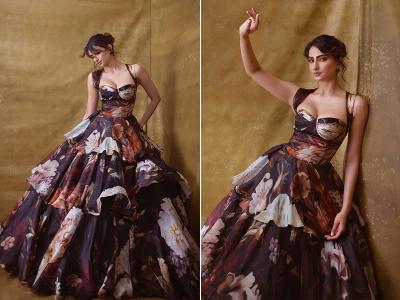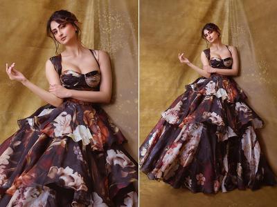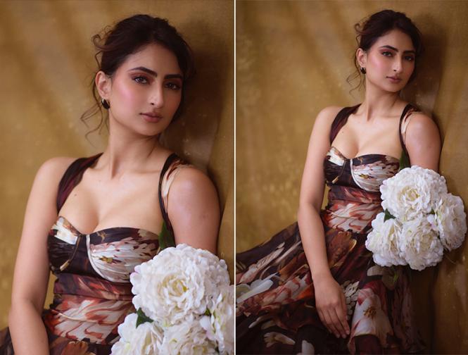 इस फोटोशूट में पलक ने फ्लोरल प्रिंट वाला स्ट्रैपलेस गाउन पहना है, जो उनके पूरे लुक को स्टाइलिश और एलिगेंट बना रहा है। गाउन के ब्राउन, बेज और ऑफ-व्हाइट शेड्स का कम्बिनेशन इसे रिच और क्लासी फील देता है।