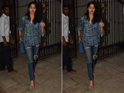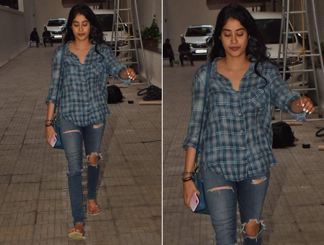 इसी दौरान जाह्नवी ब्लू शर्ट के साथ ब्लू रिप्पड जीन्स में एकदम बिंदास लुक मुंबई के बांद्रा में दिखा।