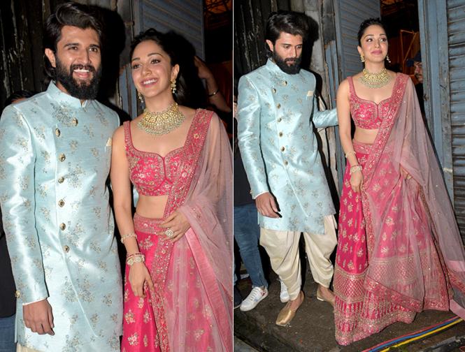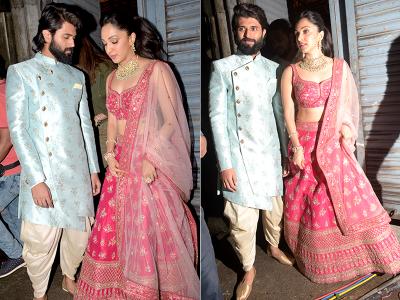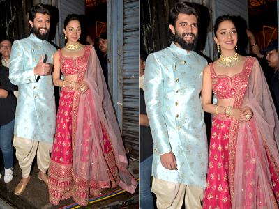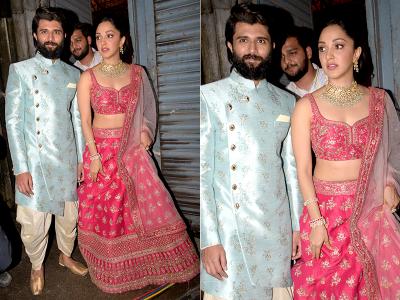 विजय शूटिंग से निकलते वक़्त ब्लू कलर के इंडो-वेस्टर्न लुक में और किआरा पीच कलर का लहंगा पहने हुए नजर आईं।