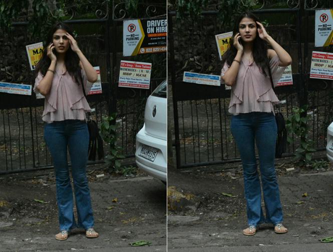 इस दौरान रिया हलके पीच कलर के टॉप और ब्लू जीन्स में नजर आईं।
