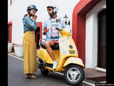 येल्लो कलर स्कूटी पर हेलमेट लगाए हुए राजकुमार राव और पत्रलेखा गोवा में घूमने की प्लानिंग करते नजर आ रहे हैं।