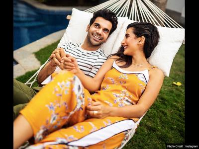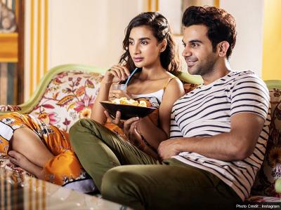 इस तस्वीर में राजकुमार राव और पत्रलेखा टीवी देखते हुए किसी फिल्म के बारे में बात कर रहे हैं।
