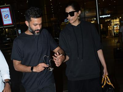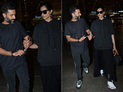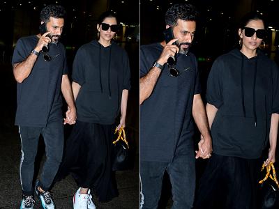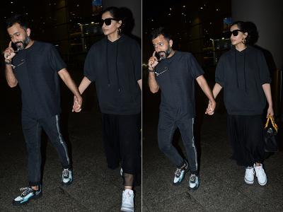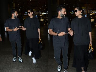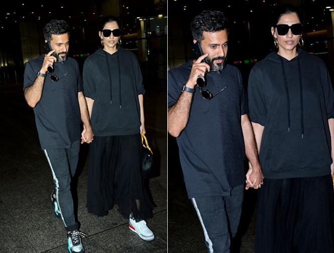एयरपोर्ट पर पर सोनम और आनंद दोनों ही ब्लैक अवतार में नजर आए।