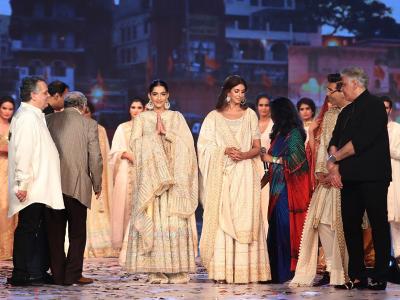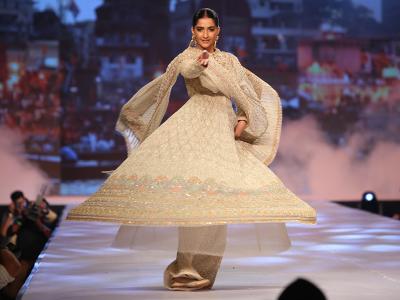 मांग में सिन्दूर, कानों में झुमके और बेहद ग्लैमरस अवतार के साथ रैंप वॉक के दौरान सोनम कपूर आईं नजर