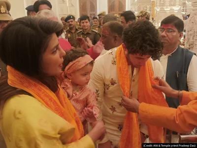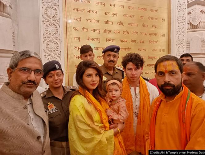 अभिनेत्री प्रियंका चोपड़ा जोनास, पति और गायक निक जोनास और उनकी बेटी मालती मैरी जोनास ने उत्तर प्रदेश के अयोध्या में राम जन्मभूमि मंदिर में पूजा की। (Credit: Instagram)