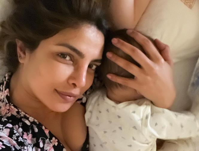 इस तस्वीर में मालती मैरी अपनी मां प्रियंका चोपड़ा की गोद लेटे हुए अपनी मां को मेकअप करती हुईं देख रही हैं। (फोटो: इंस्टाग्राम)