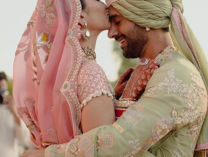 अपनी शादी में कृति गुलाबी लहंगे में दिखीं, जबकि पुलकित ने ग्रीन शेरवानी पहनी हुई थी। (फोटो- इंस्टाग्राम)