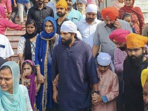 1 / 5साउथ इंडस्ट्री के सुपरस्टार अल्लू अर्जुन गुरुवार को अपनी पत्नी और बच्चों के साथ अमृतसर के स्वर्ण मंदिर पहुंचे हैं। (फोटो: Twitter)2 / 5अल्लू अर्जुन अपनी पत्नी स्नेहा रेड्डी के जन्मदिन पर पूरे परिवार के साथ वाहेगुरु का आशीर्वाद लेने पहुंचे। स्नेहा ने 29 सितंबर को अपना 37वां जन्मदिन सेलिब्रेट किया। (फोटो: Twitter)3 / 5इस दौरान अल्लू अर्जुन और उनके बेटे अयान ने कुर्ता पहना था, वहीं पत्नी स्नेहा व उनकी बेटी अरहा सूट में थे। (फोटो: Twitter)4 / 5स्वर्ण मंदिर के बाद अल्लू अर्जुन परिवार के साथ अटारी बॉर्डर पर पहुंचे, जहां फैंस उन्हें देख काफी अधिक उत्साहित हुए। (फोटो: Twitter)5 / 5अल्लू अर्जुन की फिल्म 'पुष्पा द राइज' 2021 की ब्लॉकबस्टर फिल्म साबित हुई। इस के बाद फंस इस फिल्म के अगली कड़ी पुष्पा: द रूल की खबरों का इंतजार कर रहे हैं। (फोटो: Twitter)