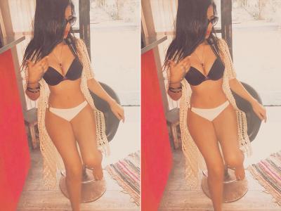 ब्लैक एंड व्हाइट की बिकीनी में साक्षी बेहद सेक्सी लग रही हैं।