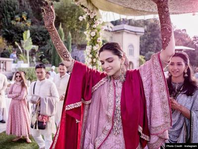 दीपिका फोटो में मेंहदी लगाए पिंक और रेड मिक्स लहंगा पहने राजसी स्टाइल में बहुत ही खूबसूरत लग रही हैं