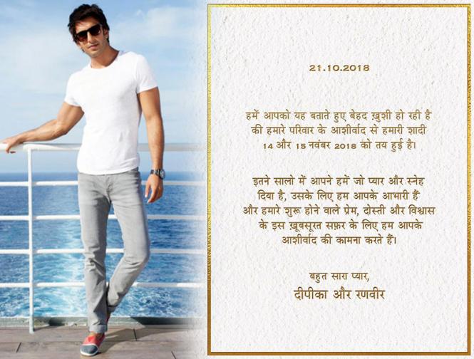 रणवीर सिंह और दीपिका पादुकोण ने अपनी शादी का कार्ड सोशल मीडिया पर किया पोस्ट