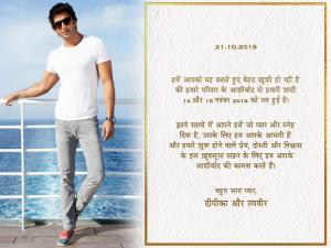 1 / 8बॉलीवुड के गलियारों में इन दिनों रणवीर सिंह और दीपिका पादुकोण की शादी के चर्चे जोरों पर हैं। 2 / 8पहली बार दोनों सितारों ने अपनी शादी पर आधिकारिक तौर पर ऐलान किया है।3 / 8दीपिका और रणवीर ने इंस्टाग्राम पर पोस्ट डालकर शादी का ऐलान कर दिया है। 4 / 8रविवार को शाम करीब 4 बजे दीपिका पादुकोण ने अपने इंस्टाग्राम अकाउंट से एक शादी के कार्ड की तस्वीर पोस्ट की।5 / 8 दीपिका ने सरेआम ऐलान किया है कि इसी साल 14 और 15 नवंबर को वो रणवीर सिंह के साथ 7 रिश्तों में बंधेंगी।6 / 8 ये खूबसूरत जोड़ी अगले महीने दीवाली के बाद (14 नवंबर) शादी के बंधन में बंधने जा रही।7 / 8 रिपोर्ट्स के मुताबिक रणवीर और दीपिका के शादी समारोह में कुल चार ग्रैंड फंक्शन होंगे इसमें रिसेप्शन सहित और भी कई फंक्शन होंगे।8 / 8इसमें परिवार के अलावा बेहद करीबी दोस्त ही शामिल होंगे।
