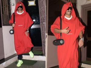 1 / 6हाल ही में रणवीर सिंह एक डबिंग स्टूडियो पहुंचे जहां उन्होंने ऐसे कपड़े पहन रखे थे जिसे देखकर आपको भी हंसी आ जाएगी।2 / 6इस दौरान रणवीर ने लाल रंग की हुडी (स्वैट शर्ट) पहनी हुई थी जो घुटनों से भी ज्यादा नीचे थी।3 / 6इसके साथ उन्होंने ब्लैक जींस और लाइट ग्रीन कलर के शूज पहन रखे थे। 4 / 6हाथ में उन्होंने एक स्पीकर ले रखा है जिसमें वो लगातार गाना सुन रहे थे।5 / 6इस लुक में रणवीर की कई फोटोज वायरल हुई हैं जिनका काफी मज़ाक बन रहा है।6 / 6कोई उन्हें तांत्रिक कह रहा है तो कोई उनका जोकर कहकर उनका मज़ाक उड़ा रहा है। कोई तो रणवीर सिंह को लाल परी बता रहा है।