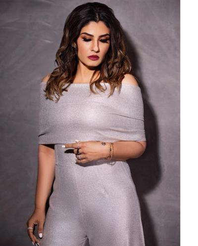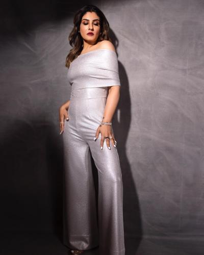 रवीना ने सिल्वर कलर का ऑफ शोल्डर जंपसूट पहने देखा जा सकता हैं। (फोटो: इंस्टाग्राम)