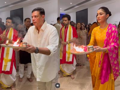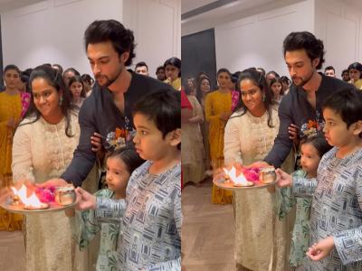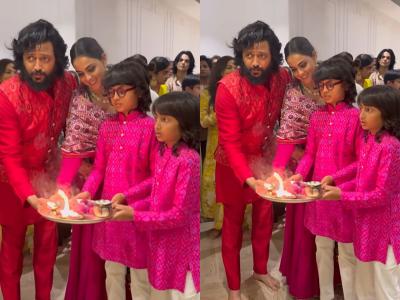 इसमें बॉलीवुड कपल रितेश देशमुख और जेनेलिया अपने बच्चों के साथ आरती करते नजर आते हैं।