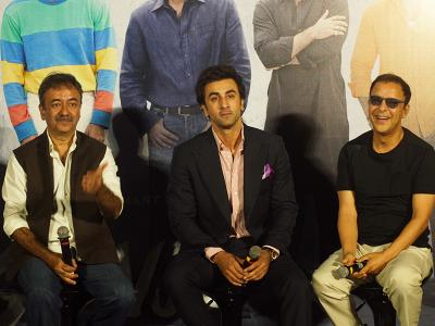 टीजर लॉन्च के मौके पर डायरेक्टर राजकुमार हिरानी, रणबीर कपूर के साथ विधु विनोद चोपड़ा।
