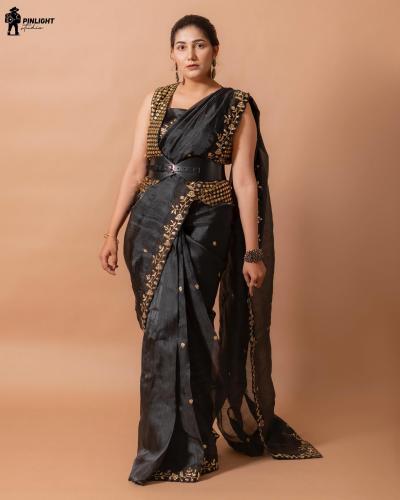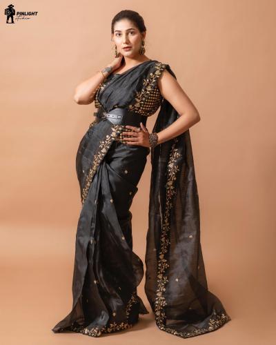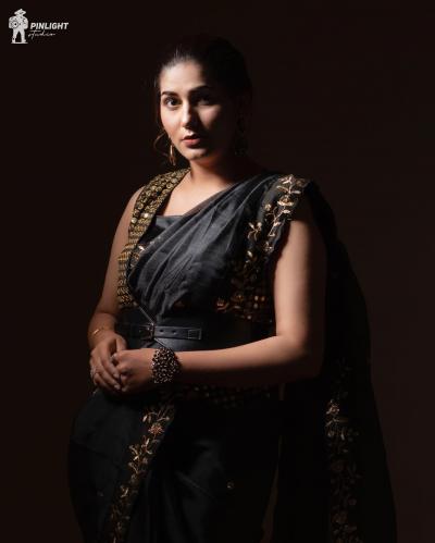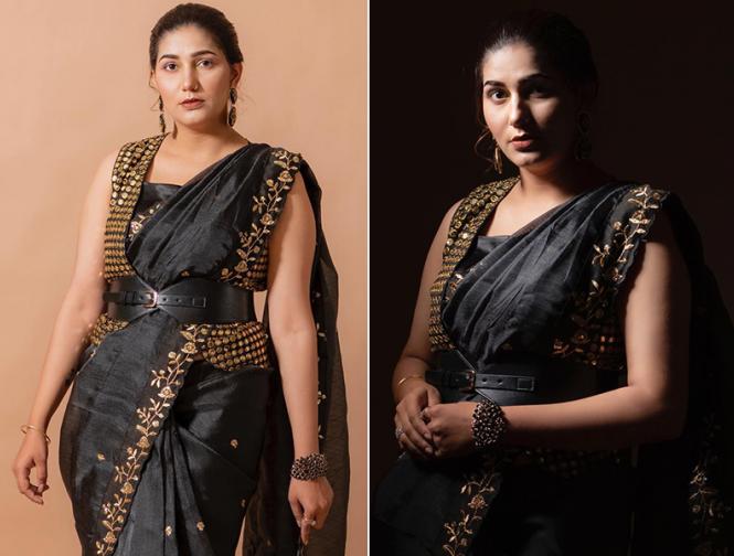 ब्लैक कलर की साड़ी के साथ सपना ने हैवी ज्वैलरी कैरी किया हुआ है और साड़ी को मॉर्डन लुक देने के लिये कमर पर बेल्ट भी बांधी हुई हैं। (फोटो: इंस्टाग्राम)