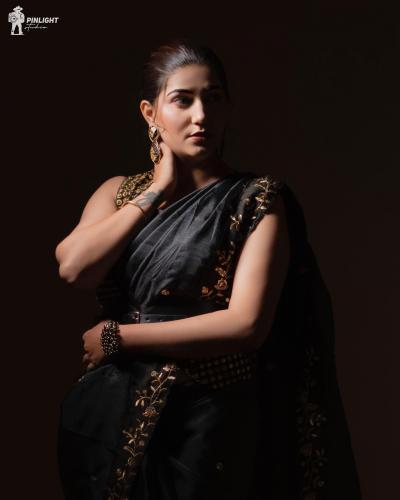 सपना चौधरी ब्लैक कलर की साड़ी पहनकर ग्लैमरस पोज देती दिख रही हैं। (फोटो: इंस्टाग्राम)