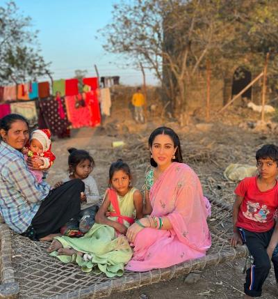 एक तस्वीर में सारा खेत में खड़ी होकर कैमरे की तरफ पीठ कर पोज दे रही हैं, वही दूसरी तस्वीर में सारा चारपाई पर कुछ बच्चों संग बैठे नजर आ रही हैं। (फोटो: इंस्टाग्राम)