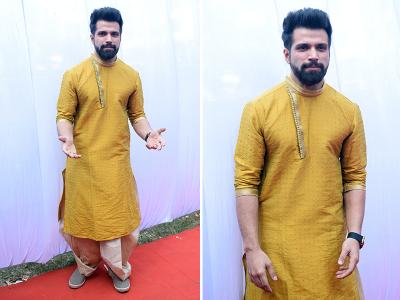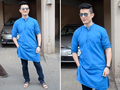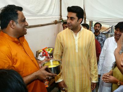 अनुराग बसु के यहां एक्टर अभिषेक बच्चन भी पीले रंग के कुर्ते में दिखे।