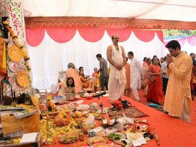 हर कोई पीले रंग के कपड़ो में पूजा में पहुंचा था