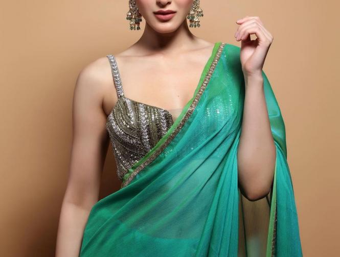 इस फोटोशूट में शनाया कपूर हरे रंग की साड़ी में बेहद स्टाइलिश लुक में नजर आ रही हैं। (फोटो: इंस्टाग्राम)