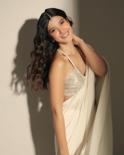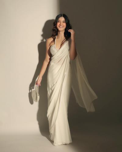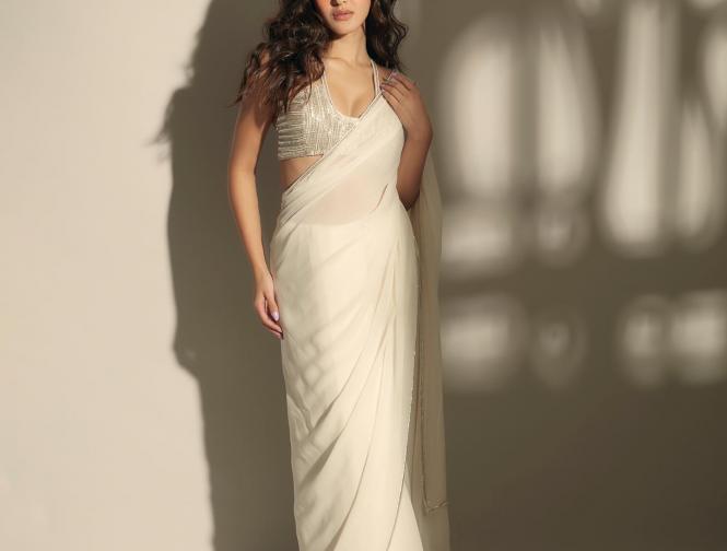 इन तस्वीरों में शनाया ऑफ व्हाइट कलर की साड़ी पहने देखा जा सकता है और इसके साथ उन्होंने मैचिंग डीपनेक ब्लाउज पेयर किया हैं। (फोटो: इंस्टाग्राम)