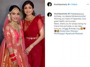 1 / 7बॉलीवुड एक्ट्रेस शिल्पा शेट्टी कुंद्रा सोशल मीडिया पर काफी एक्टिव रहती हैं और अपनी तस्वीरें-वीडियो शेयर करती रहती हैं। 2 / 7 लॉकडाउन के दौरान शिल्पा और राज की तस्वीरें और वीडियों अक्सर फैंस का मनोरंजन करती रहती हैं।3 / 7 अपनी ननद और राज कुंद्रा की बहन रीना के जन्मदिन के मौके पर शिल्पा ने इंस्टाग्राम पर खास अंदाज में बर्थडे विश किया। 4 / 7शिल्पा शेट्टी ने रीना की फोटोज के साथ एक वीडियो बनाया और इसे पोस्ट कर उन्हें विश किया। 5 / 7 शिल्पा ने इस वीडियो को पोस्ट कर लिखा, 'हैप्पी बर्थडे, रीना कुंद्रा! तुम्हारे लिए खुशियों, प्यार, अच्छी सेहत और कामयाबी की कामना करती हूं। थैंक यू रीन्स, हमेशा पहले मेरी दोस्त और फिर ननद बनने के लिए... लव यू। तुम्हें बर्थडे की बड़ी सी झप्पी (गले लगना)।' 6 / 7शिल्पा की तरह उनके पति और रीना के भाई राज कुंद्रा ने भी बर्थडे विश किया। 7 / 7फैंस भी लगातार शिल्पा के इस प्यारी सी तस्वीर पर रीना कुंद्रा को बर्थडे विश कर रहे हैं।