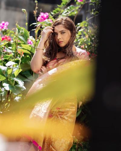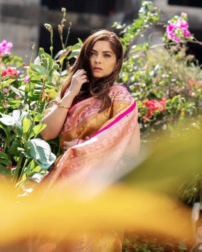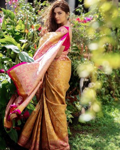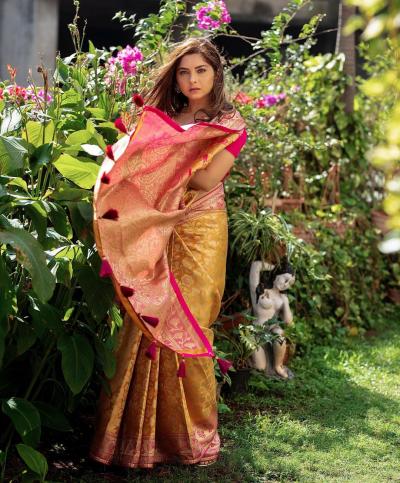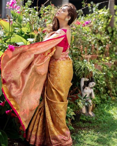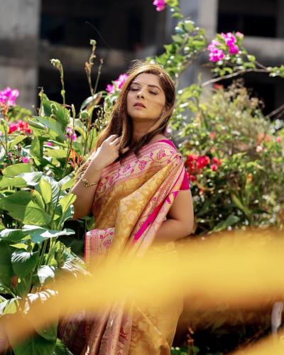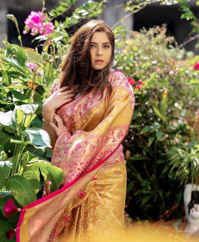 सोनाली की पीली-गुलाबी साड़ी की बात ही कुछ और है।