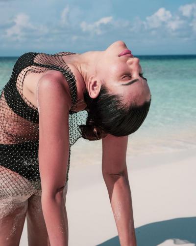 इन तस्वीरों में सोनाली ब्लैक कलर की बिकिनी पहने दिखाई दे रही हैं और ऊपर से जालीदार कपड़े के ढंका हुआ हैं। (फोटो: इंस्टाग्राम)