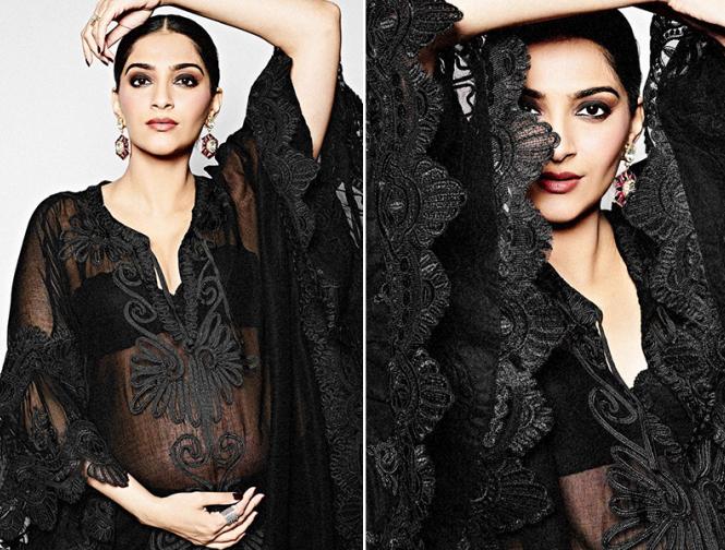 ब्लैक ट्रांसपेरेंट ड्रेस में सोनम कपूर अपना बेबी बंप फ्लॉन्ट करती दिखाई दे रही है। (फोटो: इंस्टाग्राम)