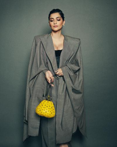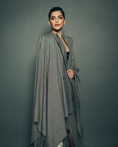 इन तस्वीरों में सोनम कपूर ग्रे कलर की लॉन्ग स्कर्ट और ग्रे रंग का लॉन्ग ब्लेजर पहना हुआ है, जिसके साथ उन्होंने एक ब्लैक डीप नेक टॉप भी वियर किया हैं। (फोटो: इंस्टाग्राम)