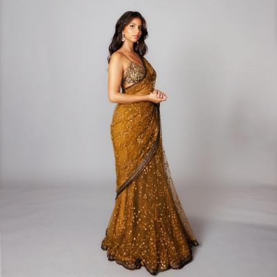 सुहाना ने गोल्डन साड़ी के साथ मैचिंग कलर का डीपनेक ब्लाउज पहने हुए नजर आ रही हैं। (फोटो: इंस्टाग्राम)