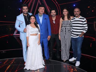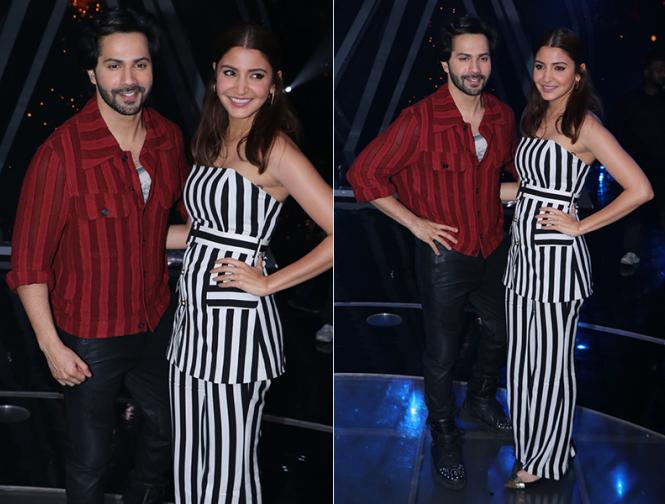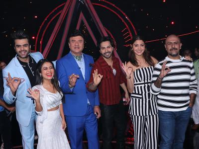 शो पर अनु मालिक, विशाल डडलानी, नेहा कक्कड़ और होस्ट मनीष पॉल के साथ वरुण और अनुष्का नजर आए।