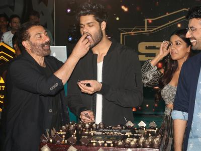 केक काटने के बाद सनी देओल करण को अपने हाथों से केक खिलते हुए दिखे