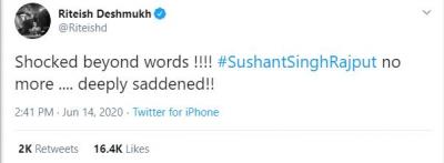 रितेश देशमुख ने कहा कि वो कितने सदमे में हैं, इसे वो शब्दों में बयां नहीं कर सकते। (फोटो सोर्स- ट्विटर)