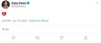 फिल्म एमएस धोनी: द अनटोल्ड स्टोरी में सुशांत सिंह राजपूत के साथ काम कर चुकीं दिशा पाटनी ने भी व्यक्त किया शोक। (फोटो सोर्स- ट्विटर)