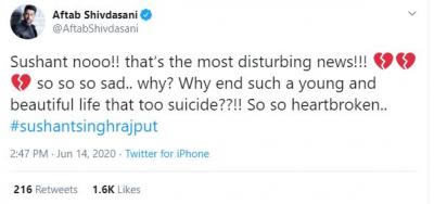 सुशांत के निधन की खबर को अफताब ने बताया डिस्टर्बिंग न्यूज़। (फोटो सोर्स- ट्विटर)