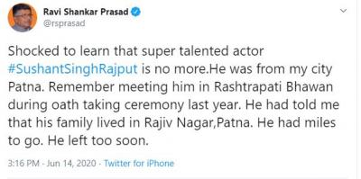 केंद्रीय मंत्री रवि शंकर प्रसाद ने सुशांत को याद कर साझा किया एक पुराना किस्सा। (फोटो सोर्स- ट्विटर)
