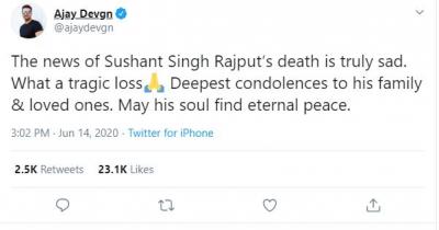 सुशांत को लेकर अजय देवगन ने भी किया ट्वीट। (फोटो सोर्स- ट्विटर)