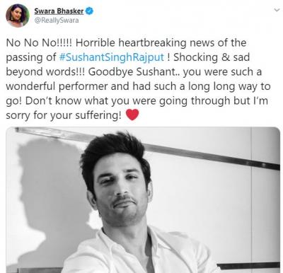 सुशांत सिंह राजपूत के निधन से सदमे में हैं बॉलीवुड एक्ट्रेस स्वरा भास्कर। (फोटो सोर्स- ट्विटर)