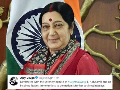 पूर्व विदेश मंत्री एवं भाजपा की वरिष्ठ नेता सुषमा स्वराज का मंगलवार रात निधन हो गया। वह 67 वर्ष की थीं। उनके निधन के बाद बॉलीवुड भी शोक में डूब गया है, बॉलीवुड के कई स्टार्स ने उन्हें श्रद्धांजलि दी है। अमिताभ बच्चन ने ट्वीट कर लिखा है "एक अत्यंत दुखद समाचार ! एक बहुत ही प्रबल राजनीतिज्ञ , एक मिलनसार व्यक्तिव , एक अद्भुत प्रवक्ता । आत्मा की शांति के लिए , प्रार्थना"