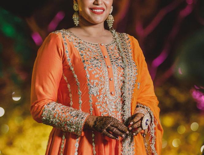 स्वरा भास्कर के लहंगे पर एम्ब्रायडरी से सिल्वर और ऑरेंज कलर के फ्लॉवर्स बनी हुई है, इसके साथ उन्होंने हैवी नेकलेस, झुमकों और चूड़ियों के साथ अपने लुक को कंप्लीट किया था। (फोटो: इंस्टाग्राम)